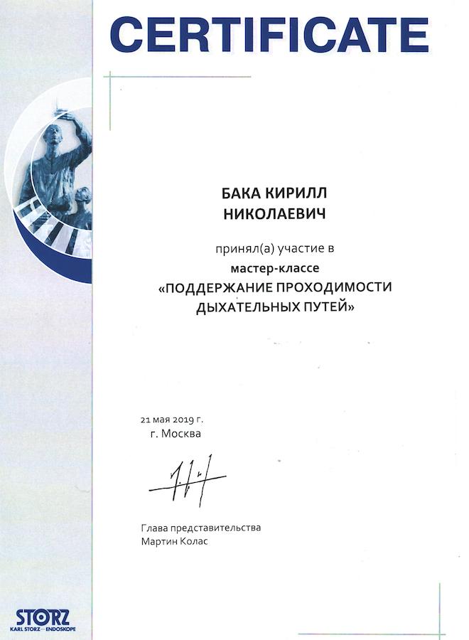 - 2019 г. – Мастер-класс «Поддержание проходимости дыхательных путей», Учебный центр Karl Storz, г.Москва