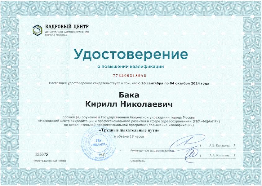 - 2024 г. – «Трудные дыхательные пути», ГБУ «Московский центр аккредитации и профессионального развития в сфере здравоохранения», г.Москва