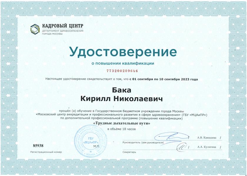 - 2023 г. – «Трудные дыхательные пути», ГБУ «Московский центр аккредитации и профессионального развития в сфере здравоохранения», г.Москва