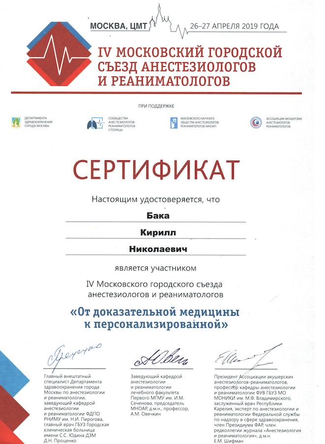 - 2019 г. – IV Московский городской съезд анестезиологов и реаниматологов «От доказательной медицины к персонализированной», г.Москва