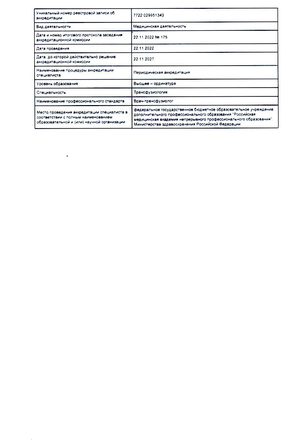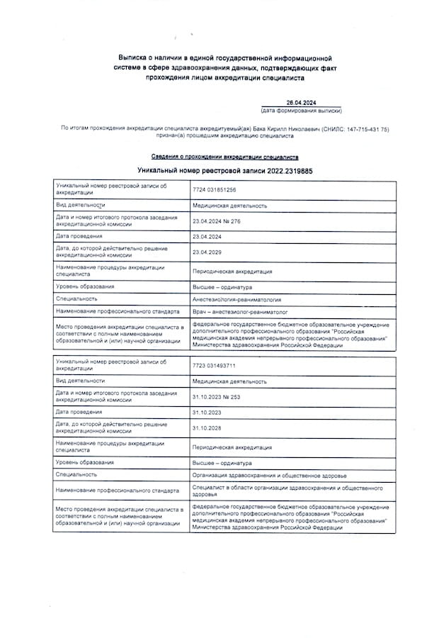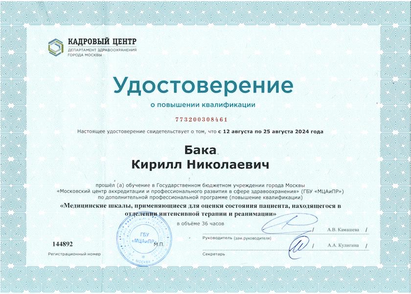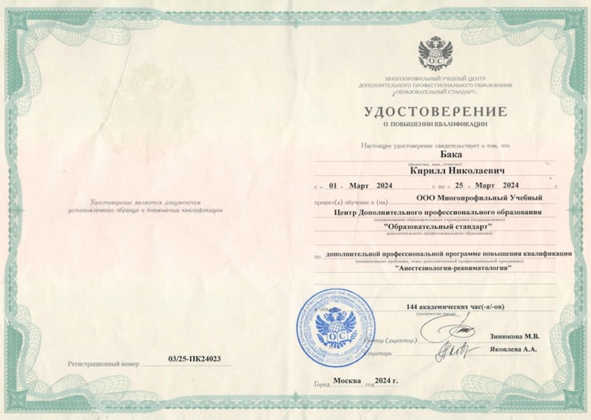 - 2024 г. – «Анестезиология и реаниматология», ООО Многопрофильный Учебный Центр Дополнительного профессионального образования «Образовательный стандарт» г.Москва