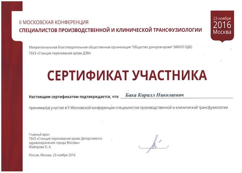 - 2016 г. – II Московская конференция специалистов производственной и клинической трансфузиологии