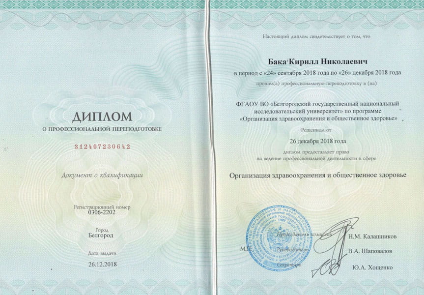 - 2018 г. – «Организация здравоохранения и общественное здоровье», ФГАОУ ВО «Белгородский государственный национальный исследовательский университет» г.Белгород