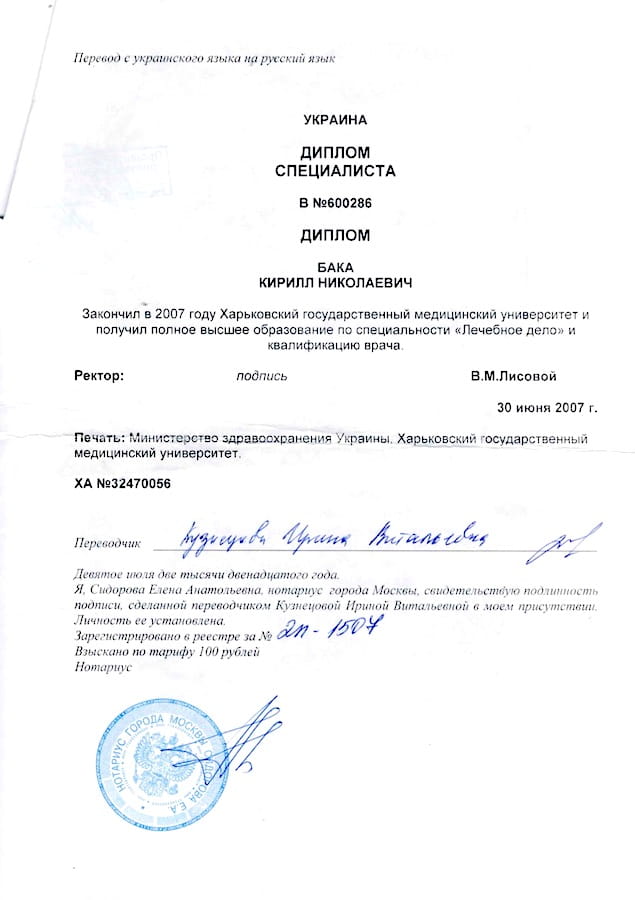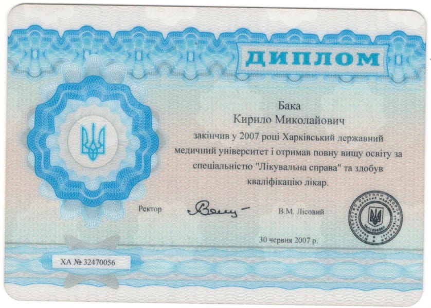 - 2007 г. – Харьковский государственный медицинский университет, «Лечебное дело»