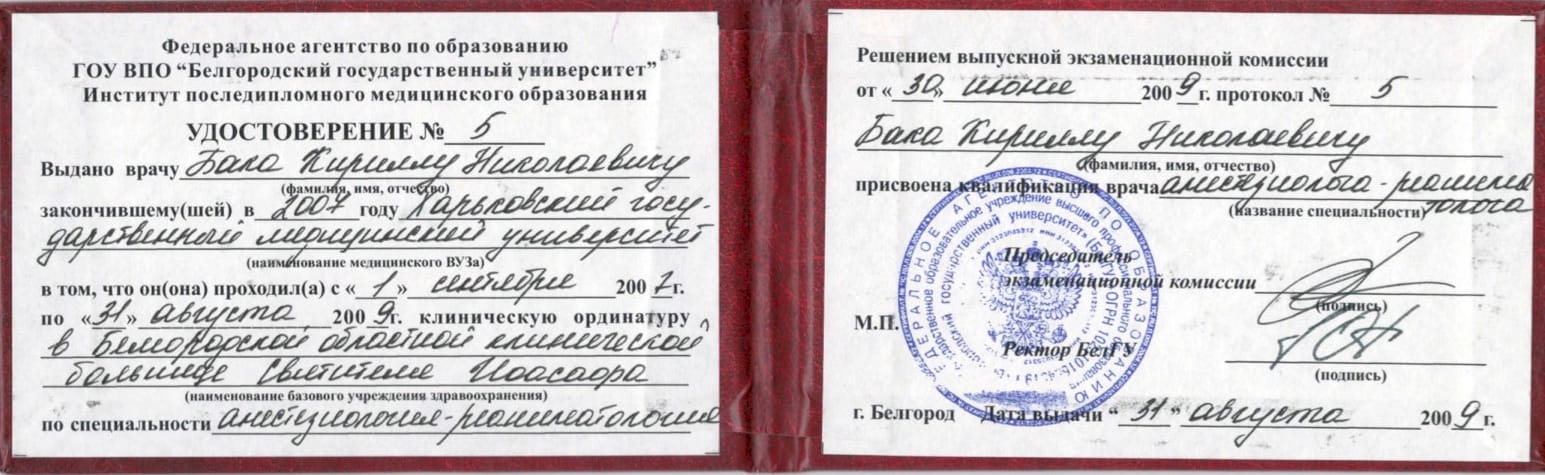 - 2009 г. – Клиническая ординатура по специальности «Анестезиология и реаниматология», ГОУ ВПО «Белгородский государственный университет» г.Белгород
