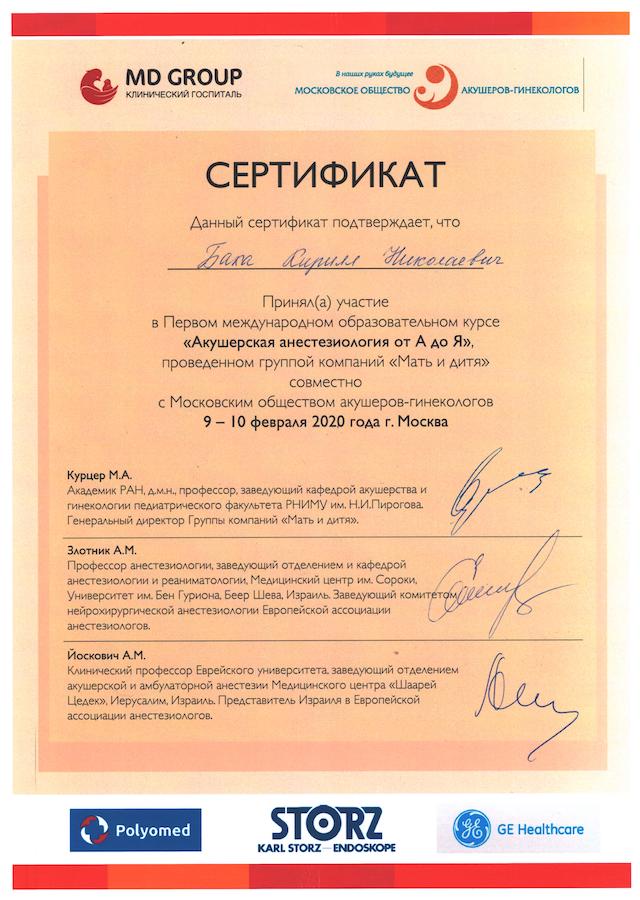 - 2020 г. – Первый международный образовательный курс «Акушерская анестезиология от А до Я», г.Москва