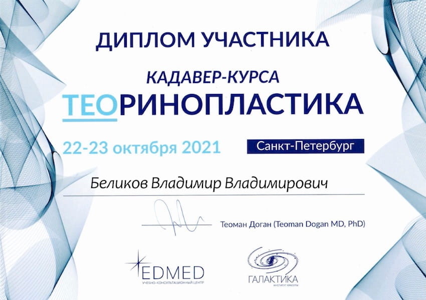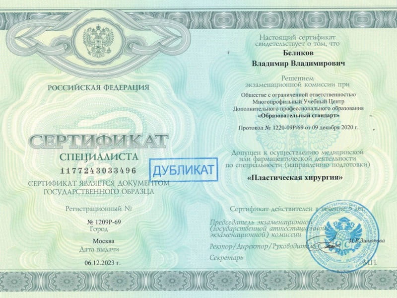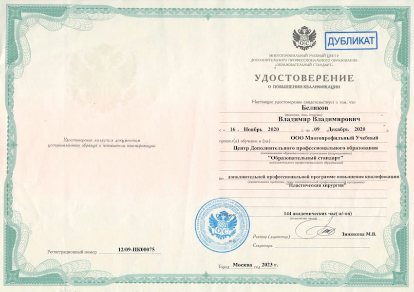 - 2023 г. – «Пластическая хирургия» (сертификат от 06.12.23), ООО Многопрофильный Учебный Центр ДПО «Образовательный стандарт» г.Москва