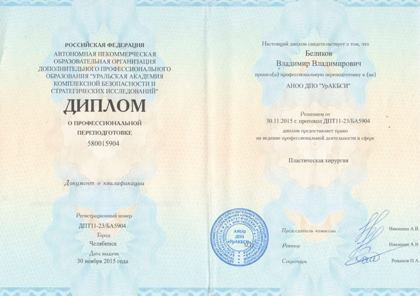 - 2015 г. – «Пластическая хирургия», АНОО ДПО «Уральская академия комплексной безопасности и стратегических исследований» г.Челябинск
