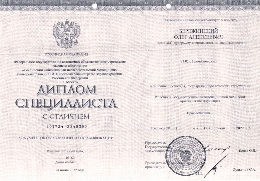 - 2022 г. - РНИМУ им. Н.И. Пирогова Минздрава России, Лечебное дело