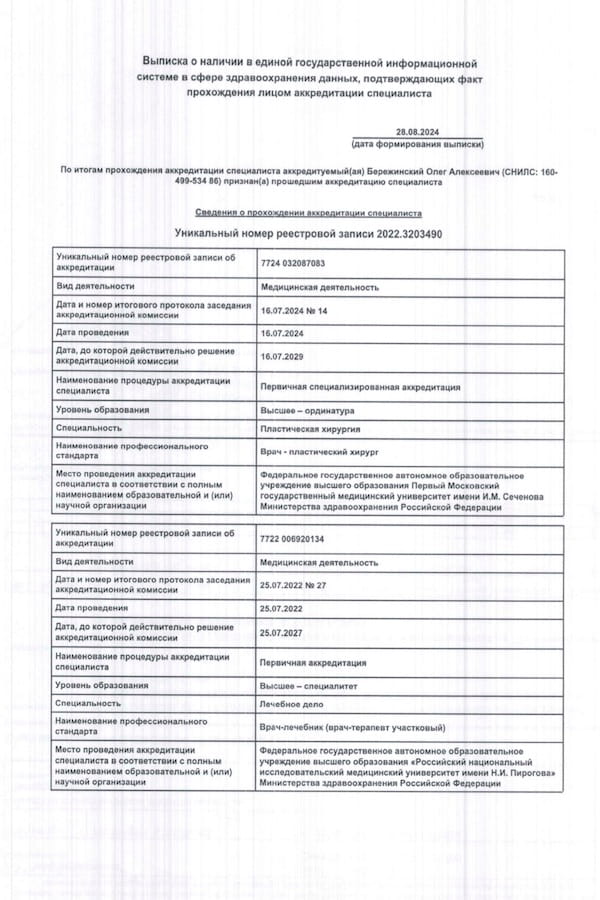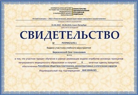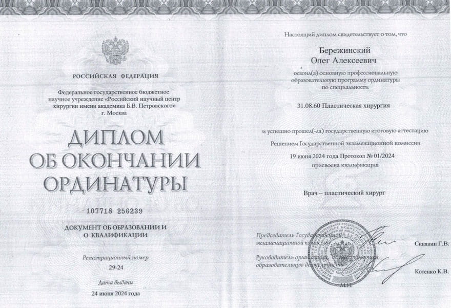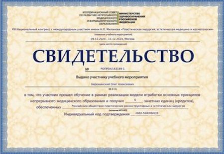 - 2024 г. – Первичная специализированная аккредитация «Пластическая хирургия», ФГАОУ ВО «Первый Московский государственный медицинский университет имени И.М. Сеченова» МЗ РФ