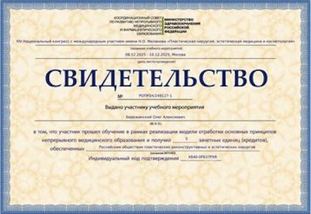 Олег Алексеевич Бережинский – постоянный участник ведущих конгрессов и конференций в области эстетической медицины и пластической хирургии. Это позволяет ему быть в авангарде мировых тенденций, внедряя в свою практику самые прогрессивные методики.