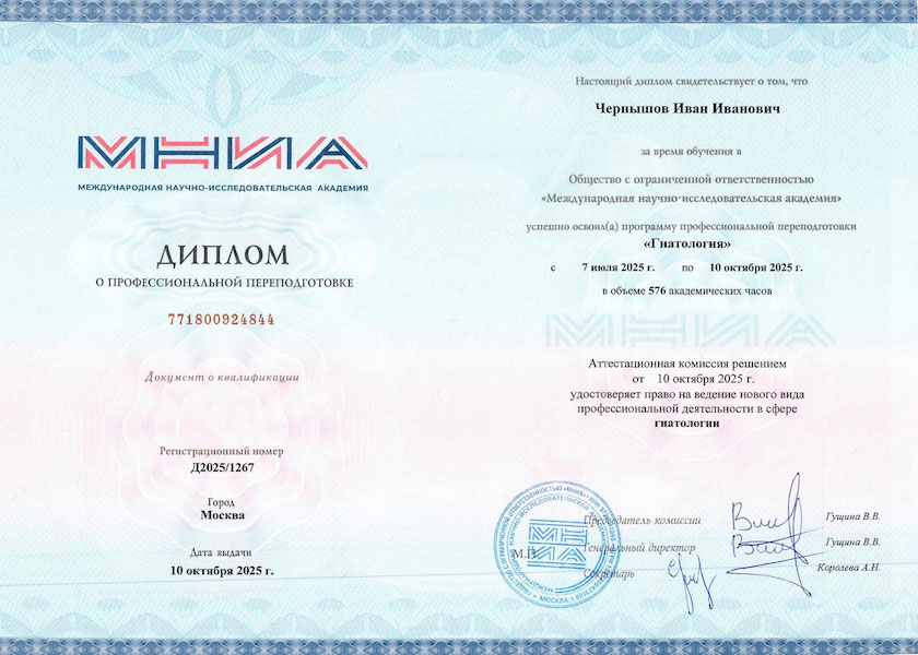 - 2025 г. – Профессиональная переподготовка по специальности «Гнатология», ООО «Международная научно-исследовательская академия», г.Москва