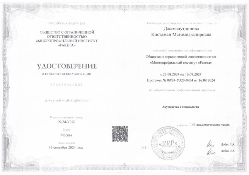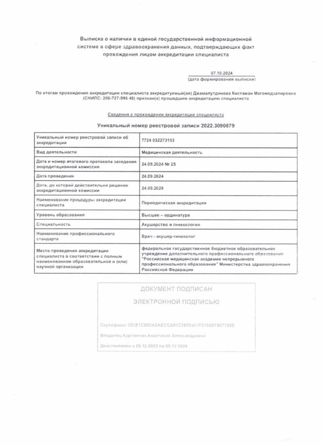 - 2019 г. – Сертификационный курс по акушерству и гинекологии, ФГБУ «НМИЦ АГП им. В.И. Кулакова»