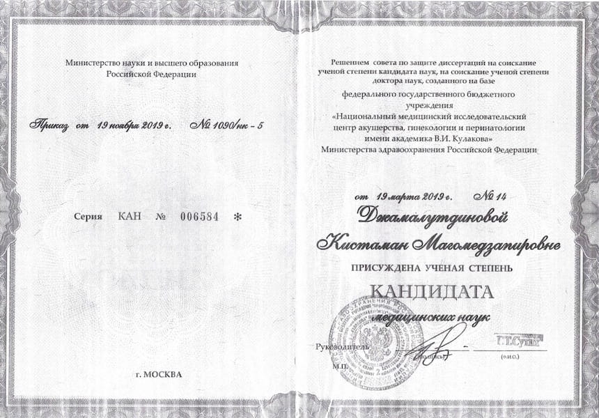 - 2019 г. – Защита диссертации на соискание ученой степени кандидата медицинских наук на тему «Аденомиоз: клинико-морфологические различия и современные методы лечения», ФГБУ «НМИЦ АГП им. В.И. Кулакова»
