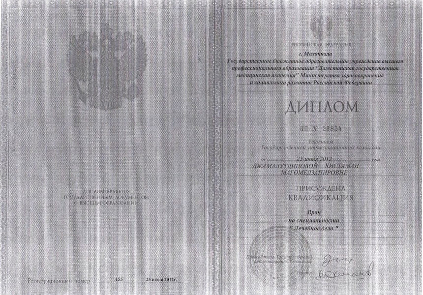 - 2012 г. – «Лечебное дело», Дагестанская государственная медицинская академия