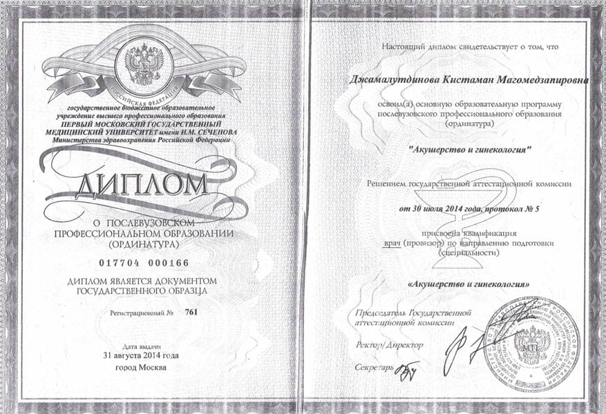 - 2014 г. – Ординатура по специальности «Акушерство и гинекология», Первый Московский государственный медицинский университет им. И.М. Сеченова на базе ФГБУ «НМИЦ АГП им. В.И. Кулакова»