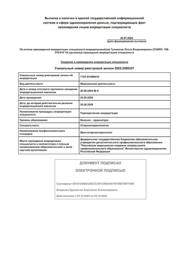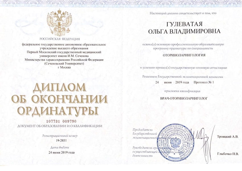 - 2019 г. – Ординатура по специальности «Оториноларингология», ФГАОУ ВО «Первый МГМУ им. И.М. Сеченова» МЗ РФ, г.Москва