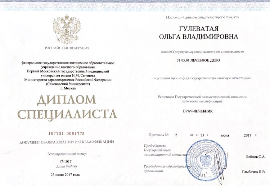 - 2017 г. – «Лечебное дело», ФГАОУ ВО «Первый МГМУ им. И.М. Сеченова» МЗ РФ, г.Москва
