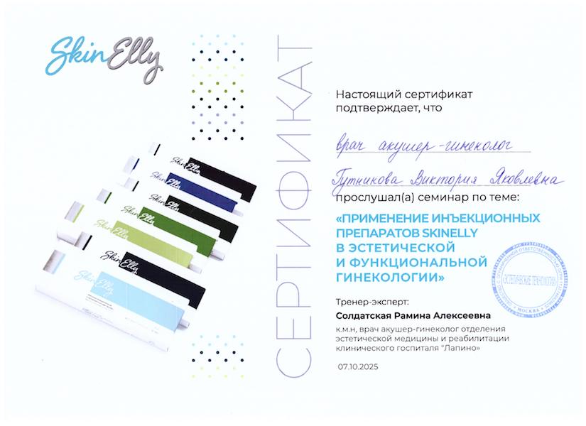 - 2025 г. – семинар «Применение инъекционных SkinElly в эстетической и функциональной гинекологии», ООО «Эстетические технологии»