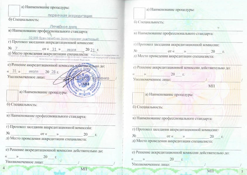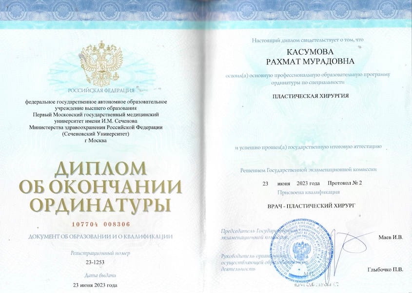 - 2023 г. – Ординатура в ПМГМУ им. И.М.Сеченова по программе «Пластическая хирургия» на кафедре онкологии, реконструктивно-пластической хирургии и радиологии
