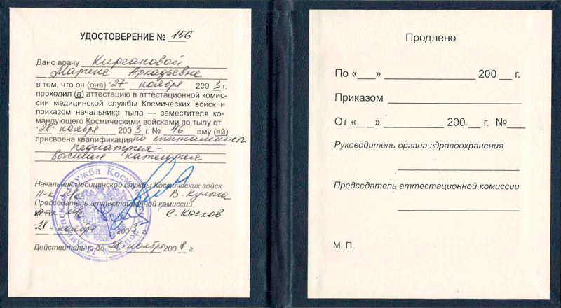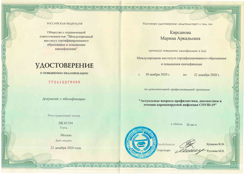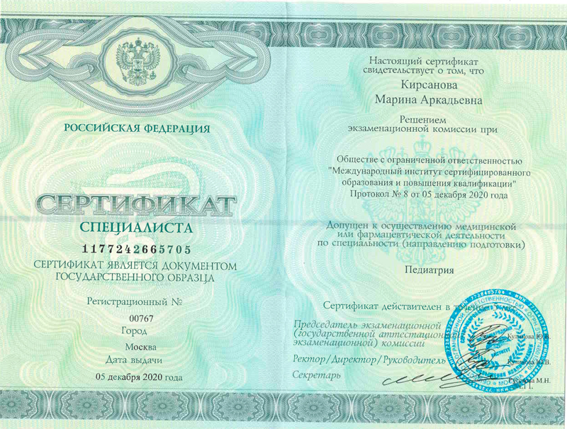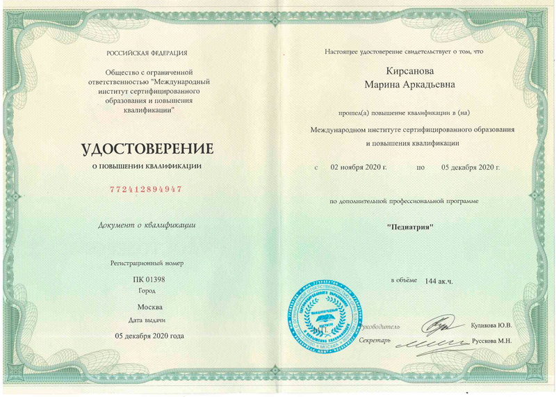 - 2020 г. – "Педиатрия", ООО "Международный институт сертифицированного образования и повышения квалификации"