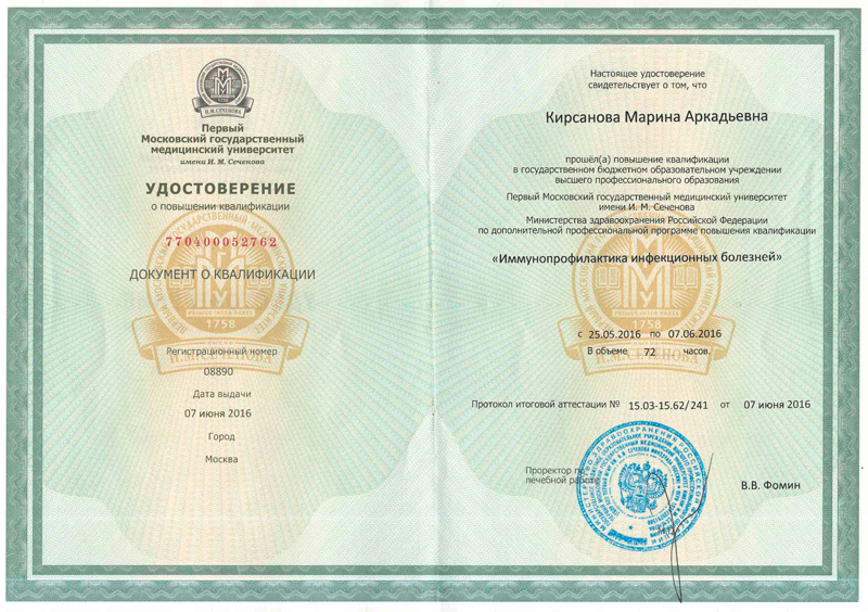- 2016 г. – "Иммунопрофилактика инфекционных болезней", Первый МГМУ им. И.М. Сеченова