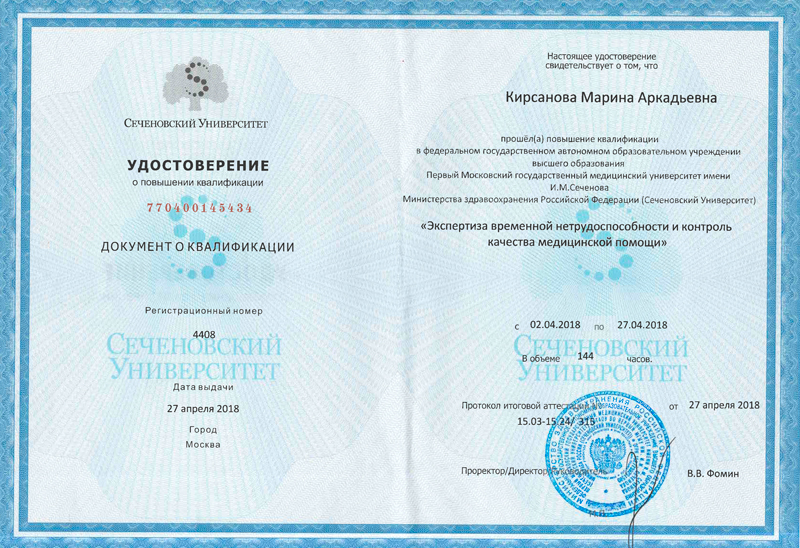 - 2018 г. – "Экспертиза временной нетрудоспособности и контроль качества медицинской помощи", Первый МГМУ им. И.М. Сеченова