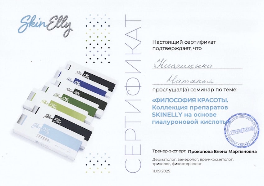 - 2025 г. – «Философия красоты. Коллекция препаратов SKINELLY на основе гиалуроновой кислоты», ООО «Эстетические технологии»