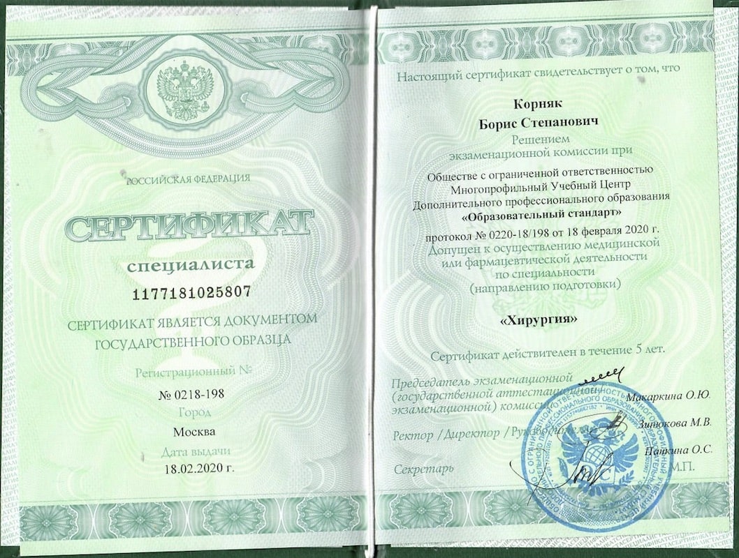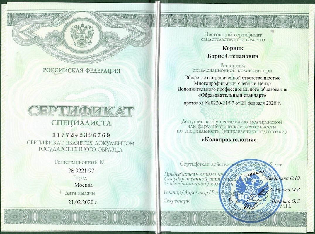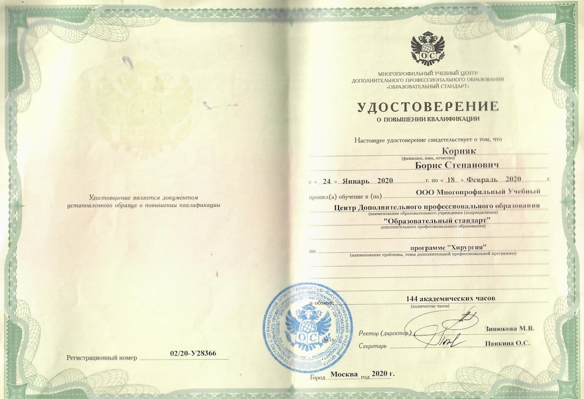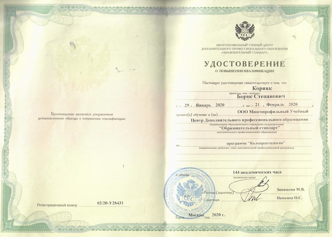 - 2020 г. – «Колопроктология» и «Хирургия», Многопрофильный учебный центр дополнительного профессионального образования «Образовательный стандарт»