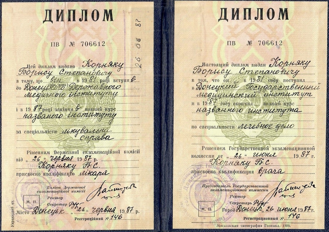 - 1987 г. – Высшее образование «Лечебное дело», Донецкий государственный медицинский институт им. М. Горького