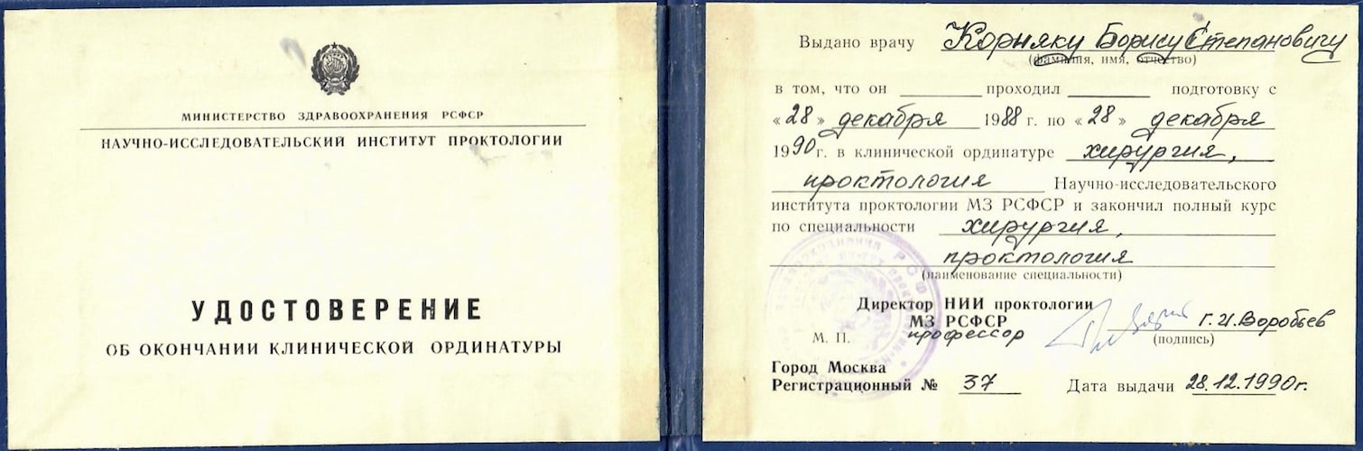 - 1990 г. – Ординатура «Хирургия, проктология», НИИ проктологии МЗ РСФСР г. Москва