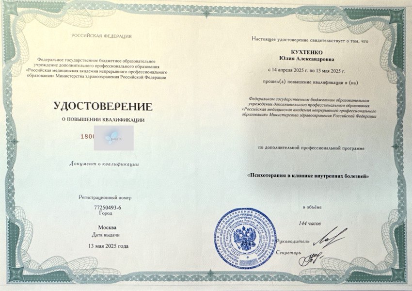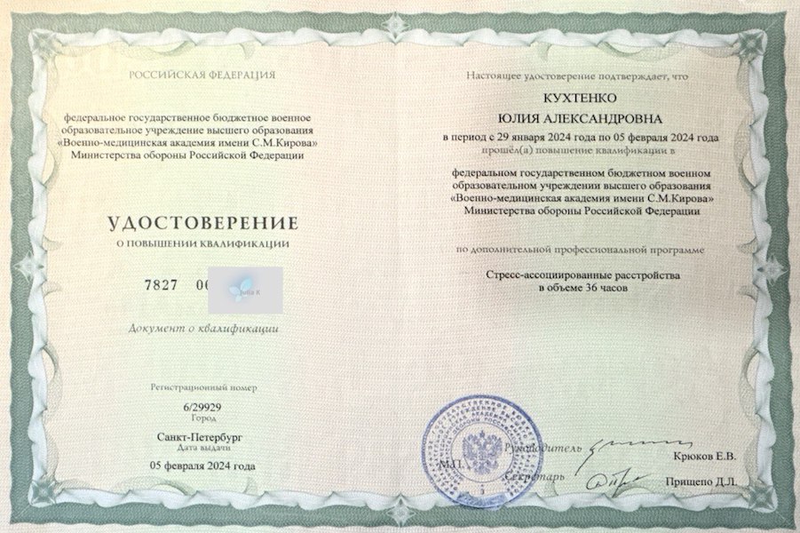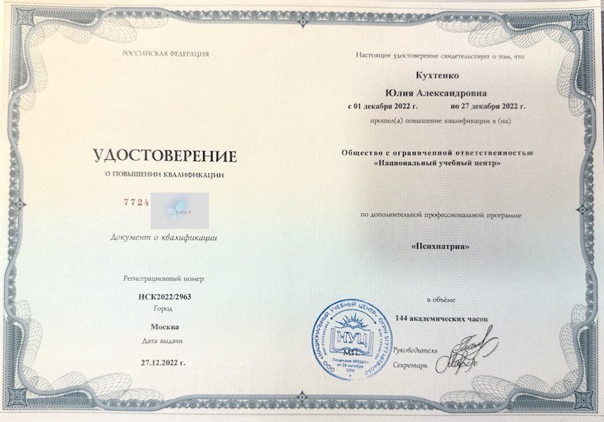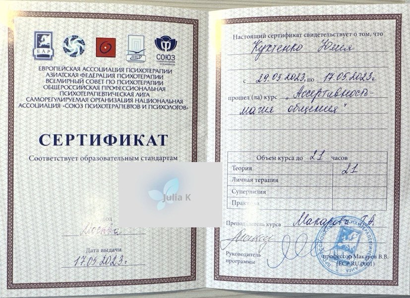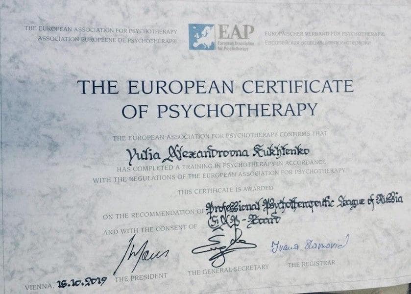 - Психотерапевт единого европейского реестра EuroPsy: KUKHTENKO YULIA (0337 ECPgpRU).