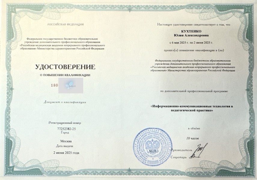 - 2025 г. – «Информационно-коммуникационные технологии в педагогической практике», ФГБОУ ДПО «Российская медицинская академия непрерывного профессионального образования» МЗ РФ, г.Москва