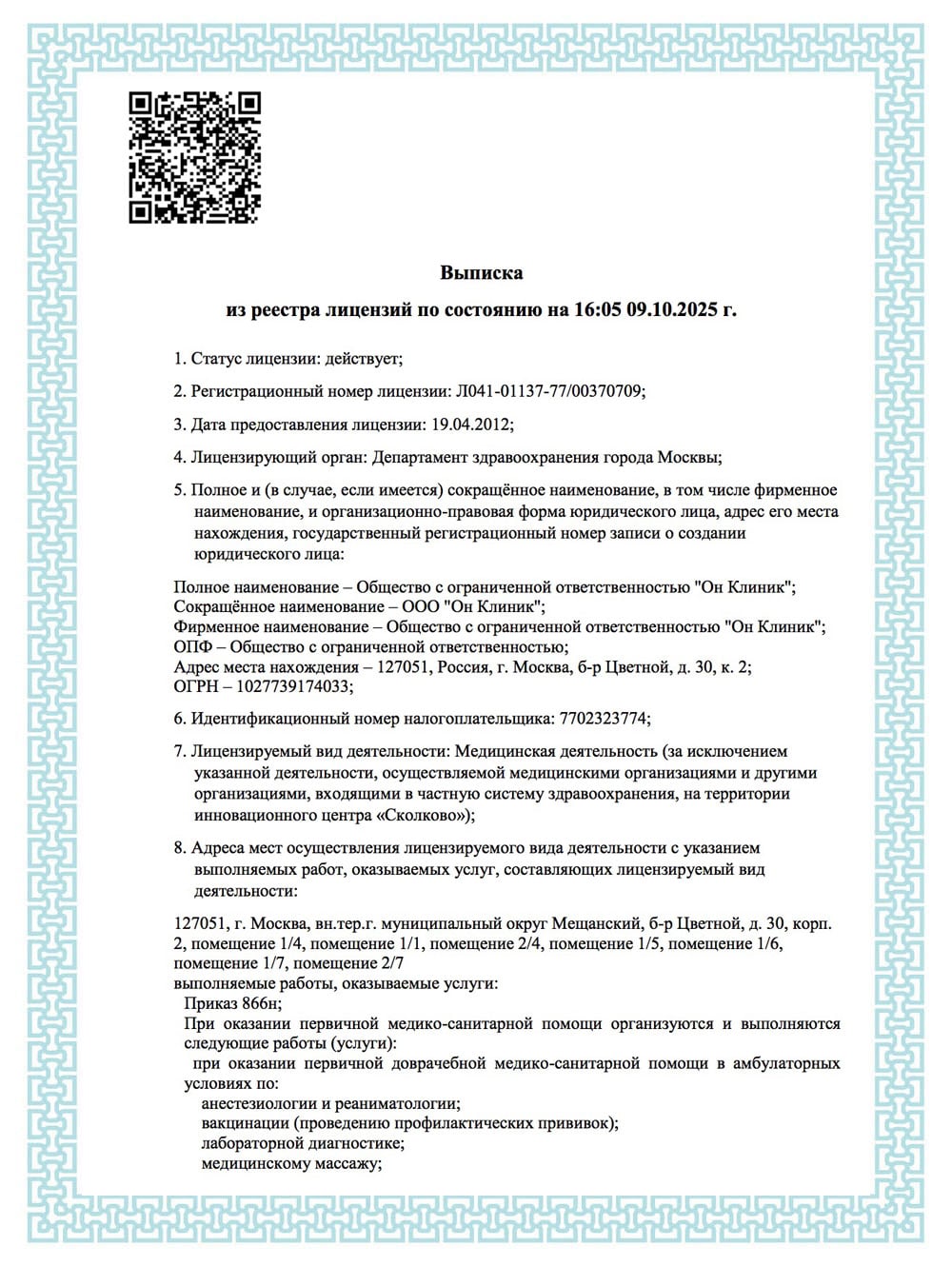 Лицензия ООО «Он Клиник» №Л041-01137-77/00370709 от 19.04.12