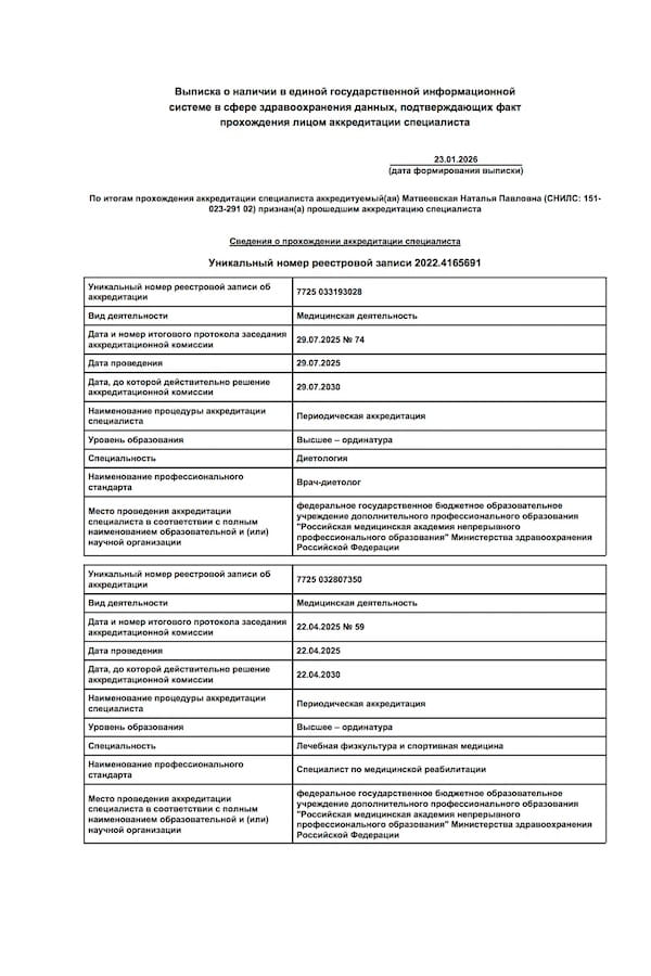 - 2025 г. – Периодическая аккредитация «Диетология», ФГБОУ ДПО «Российская медицинская академия непрерывного профессионального образования» МЗ РФ
