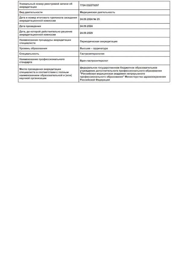 - 2024 г. – Периодическая аккредитация «Гастроэнтерология», ФГБОУ ДПО «Российская медицинская академия непрерывного профессионального образования» МЗ РФ