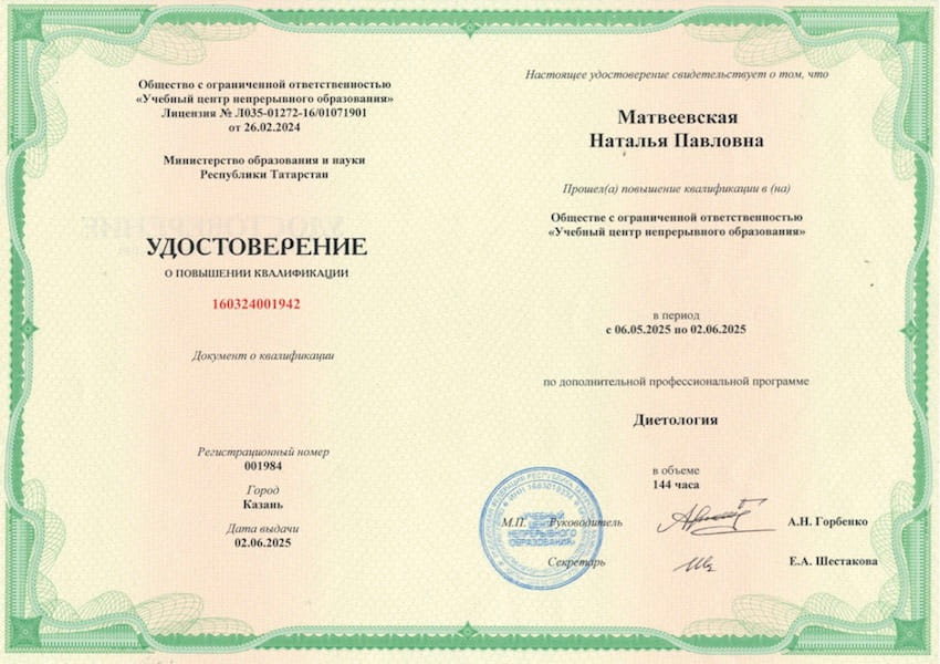 - 2025 г. – «Диетология», ООО «Учебный центр непрерывного образования», г.Казань