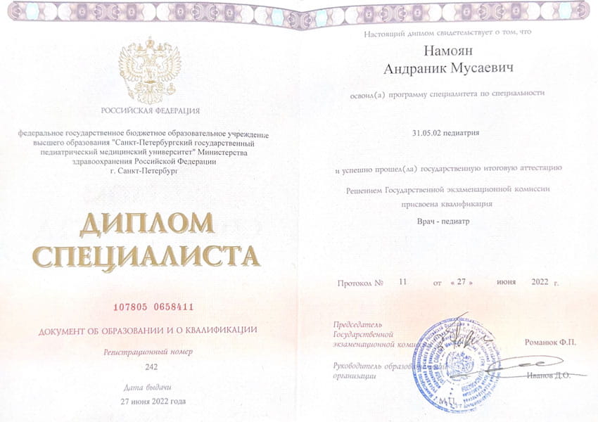 - 2022 г. – Специализация «Педиатрия», ФГБОУ ВО «Санкт-Петербургский государственный педиатрический медицинский университет» МЗ РФ, г.Санкт-Петербург