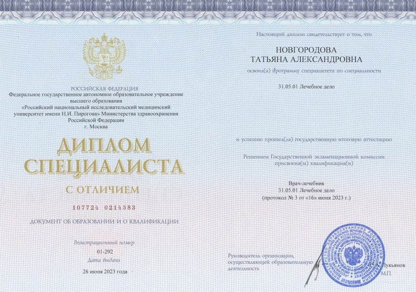 - 2023 г. – ФГАОУ ВО «Российский национальный исследовательский медицинский университет им. Н.И. Пирогова» по специальности «Лечебное дело», г.Москва. Диплом с отличием