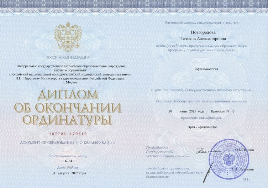 - 2025 г. – Ординатура по офтальмологии, ФГАОУ ВО «Российский национальный исследовательский медицинский университет им. Н.И. Пирогова», г.Москва. Диплом с отличием