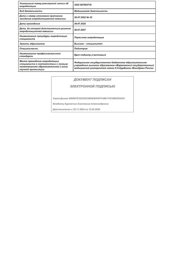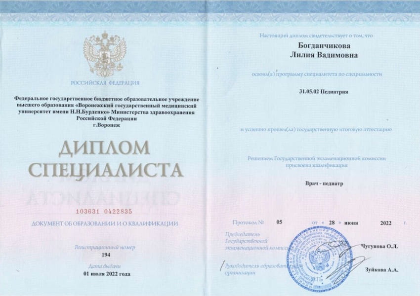 - 2022 г. – Воронежский государственный медицинский университет им. Н.Н. Бурденко, Педиатрия, Базовое образование