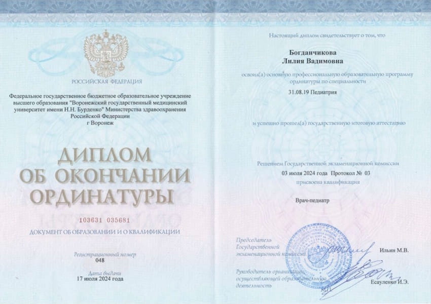 - 2024 г. – Воронежский государственный медицинский университет им. Н.Н. Бурденко, Педиатрия, Ординатура