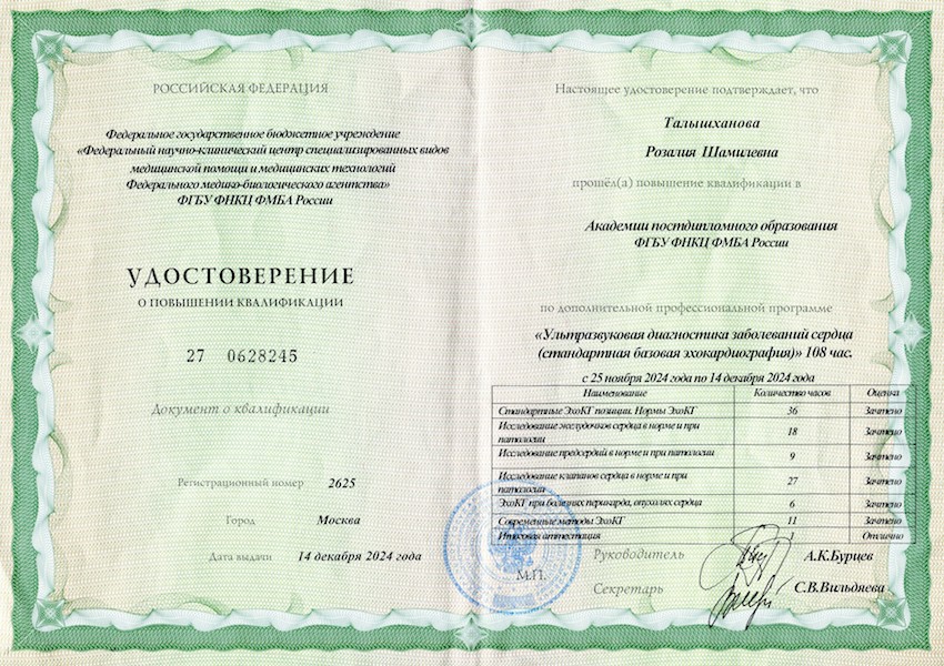 - 2024 г. – повышение квалификации в Академии постдипломного образования ФГБУ ФНКЦ ФМБА России по программе: «Ультразвуковая диагностика заболевания сердца (стандартная базовая эхокардиография)»