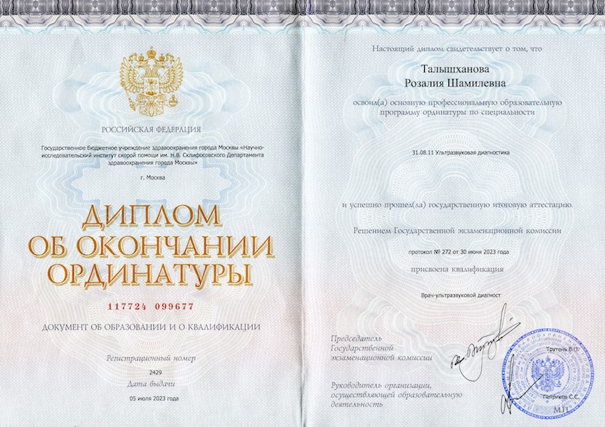 - 2023 г. – Ординатура по специальности «Ультразвуковая диагностика» в НИИ скорой помощи Н.В. Склифосовского, г.Москва