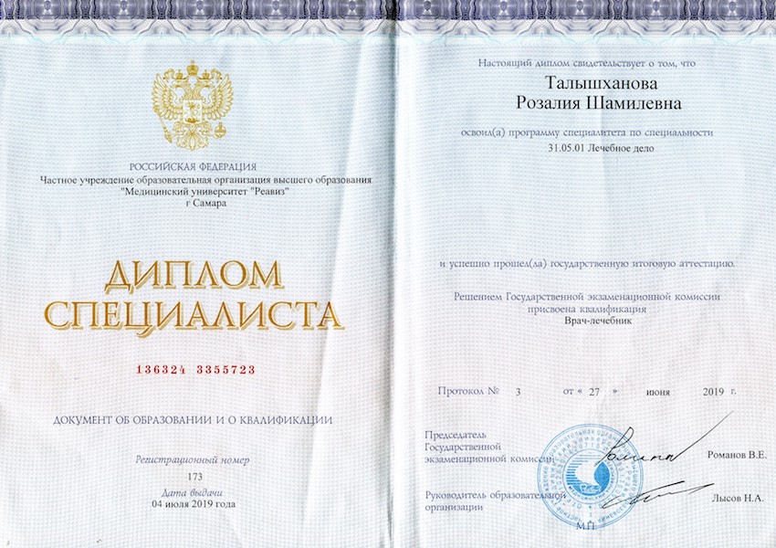 - 2019 г. – ЧУОО ВО «Медицинский университет «Реавиз» г.Самара. Специальность: Лечебное дело. Квалификация: врач-лечебник