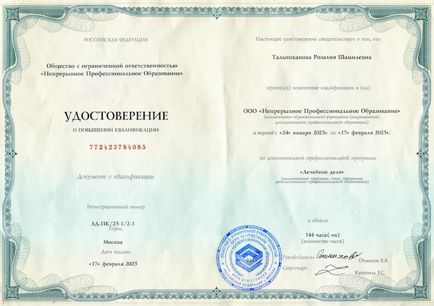 - 2025 г. – повышение квалификации ООО «Непрерывное Профессиональное Образование» по программе: «Лечебное дело»