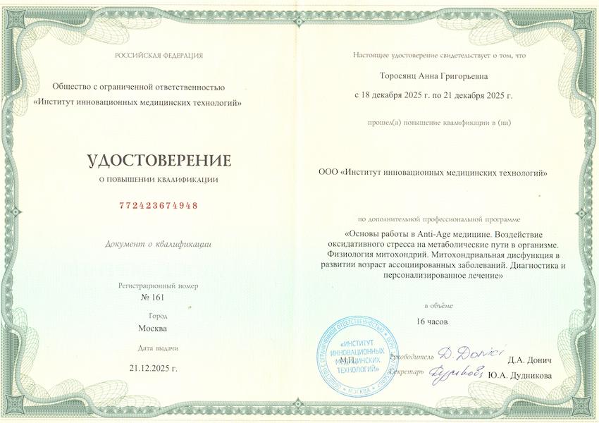 - 2025 г. – "Основы работы в Anti-Age медицине. Воздействие оксидативного стресса на метаболические пути в организме. Физиология митохондрий. Митохондриальная дисфункция в развитии возраст ассоциированных заболеваний. Диагностика и персонализированное лечение", ООО "Институт инновационных медицинских технологий", г.Москва
