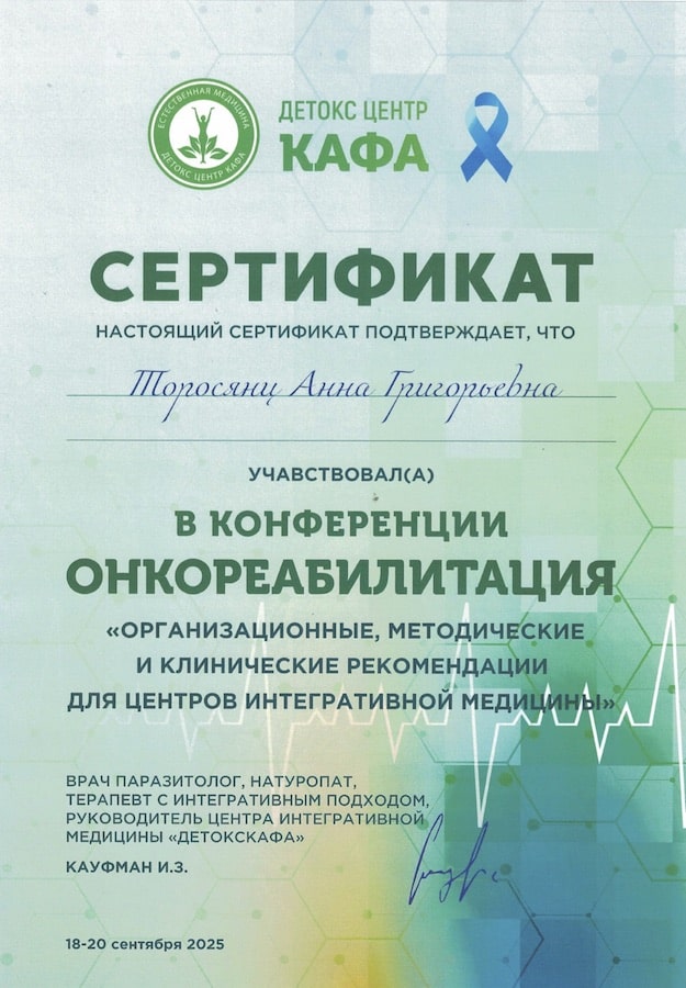 - 2025 г. – Конференция "Онкореабилитация", Центр интегративной медицины "Детокскафа"
