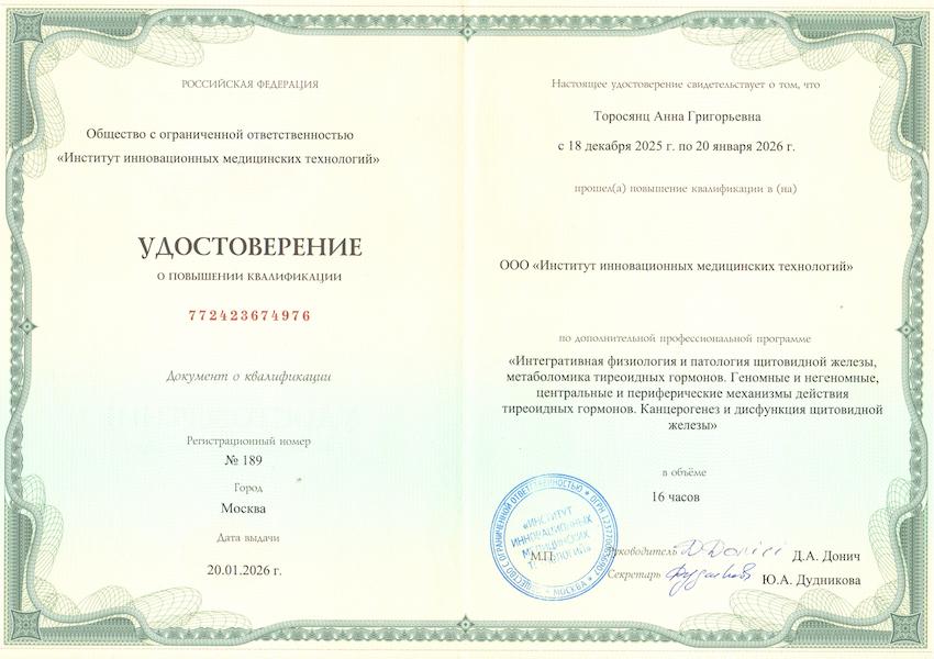 - 2026 г. – "Интегративная физиология и патология щитовидной железы, метаболомика тиреоидных гормонов. Геномные и негеномные, центральные и периферические механизмы действия тиреоидных гормонов. Канцерогенез и дисфункция щитовидной железы", ООО "Институт инновационных медицинских технологий", г.Москва
