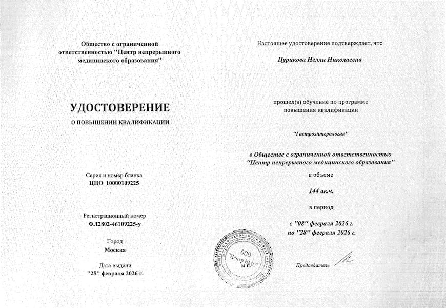 Два года назад у меня диагностировали болезнь Крона. И вот я лечусь у Цуриковой Нелли Николаевны. Пришла к ней по рекомендации и ни разу не пожалела. Доктор очень скрупулезная, на первом же приеме спокойно, не торопясь, изучила все мои анализы и исследования, подробнейшим образом расспросила о симптомах. Назначила грамотное лечение, всё понятно объяснила. Сейчас вижу стойкую положительную динамику. Что особенно ценно – Нелли Николаевна всегда корректирует терапию по результатам анализов и моему самочувствию. Такой заботы я не встречала ни у одного другого врача.